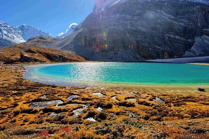每年10月是稻城最美的季節(jié),初秋的稻城已經(jīng)是絢麗多彩的,大片大片的高原草甸逐漸變?yōu)辄S綠色,環(huán)抱高原海子的水草也由養(yǎng)眼的綠色向迷人的金色過渡。