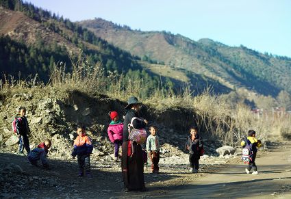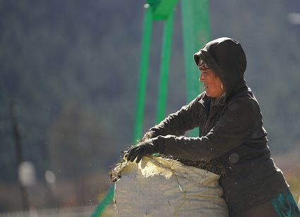一群孩子會準(zhǔn)時來小二樓叫我,要去密林,要去山岡,要去尋找?guī)в薪?jīng)文的瑪尼石,還要去那個神秘的洞頂。比孩子們更準(zhǔn)時的是掛在小二樓上的四個大喇叭,鳥雀剛醒來,廣播就開始了,就必須要起來了。穿過巷道,和打豆子的人們一起享受勞動的幸福。我們在一起,等待著下午的廣播,因為廣播會給我們帶來無盡的喜悅。