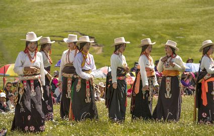 據(jù)說(shuō)早在吐蕃時(shí)期,人們以村寨為單位,在本教僧人的帶領(lǐng)下高舉幡桿,手拿青棵、麥穗,繞田間地頭轉(zhuǎn)圈,祈禱神靈保佑,獲得豐收。儀式結(jié)束后,就在草場(chǎng)上展開(kāi)角斗、斗劍、耍梭標(biāo)等活動(dòng)。格魯派興起后,這一活動(dòng)仍得到保留,只是在繞地巡游時(shí),人們要舉佛像、背經(jīng)文,文體活動(dòng)也增加了賽馬、射箭、馬術(shù)、藏戲、民間歌舞等內(nèi)容。解放后,革去了繞地巡游等一些宗教儀軌,增加了許多休閑娛樂(lè)、物資交流的內(nèi)容。“望果節(jié)”沒(méi)有固定日期,各地根據(jù)農(nóng)事而定,一般在秋收前(8月)擇吉日舉行,時(shí)間1-3天。