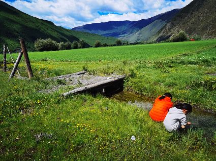 一處處水洼,清冽透亮,遠(yuǎn)處的花樹(shù)、房屋在水面的倒影隨微風(fēng)輕輕蕩漾,水里,蝌蚪在草間嬉戲,水邊,身著彩衣的孩童駐足玩耍,羨慕她們的童年,更羨慕她們的童年在這樣如畫的美景里。