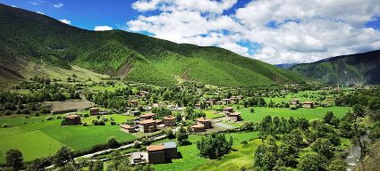 夏日,暖陽(yáng)溫柔,沿途入眼皆是綠意。聽(tīng)說(shuō),俄色花盛放的時(shí)候,潔白的花成簇成團(tuán),一樹(shù)樹(shù)漫山遍野,像九天的云朵堆滿山谷田野,汽車從公路疾馳,風(fēng)里都是俄色的清香。我們來(lái)的時(shí)候稍微遲了,錯(cuò)過(guò)了俄色的花期,花開(kāi)荼蘼,殘花在蒼翠的枝葉里躲藏,風(fēng)里是飛舞的花瓣,紛紛揚(yáng)揚(yáng),在棕紅的棧道鋪成白色的云錦,樹(shù)下是芬芳的余味。棧道邊,金黃的雪白的野花鋪灑在翠綠的草甸上,像濃烈的水彩。地里的青稞,綠得晃人眼睛,綿延的是木雅人勤勞與希望。遠(yuǎn)處,木雅民居在各種深綠淺綠的陪襯下更加的濃墨重彩。