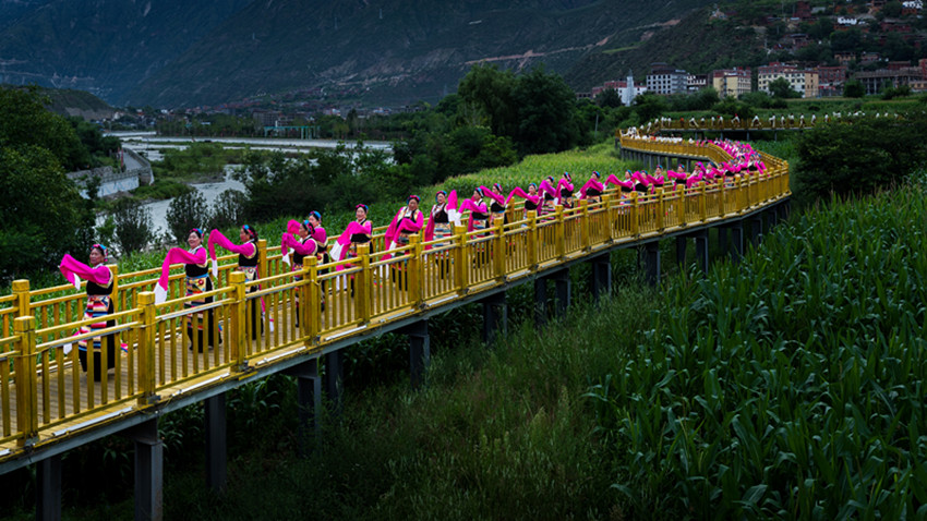 金弦子廣場,舞者們仿若守護(hù)者一般,圍著金黃色的弦子雕塑,或輕歌曼舞或昂揚踏步,斑斕的畢旺、搖曳的流蘇和飄逸的紅袖與花共舞,與景相映,聲聲吟唱、步步踏尋,是追憶更是誓言。