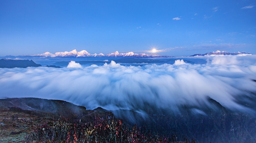 正因為貢嘎雪山具有這樣的特點,一代接一代的攝影人為了看到與眾不同的貢嘎雄姿,不辭辛勞,不斷尋找新的拍攝角度、不同的拍攝機(jī)位和發(fā)現(xiàn)新的景觀,只為從另一個視覺一睹貢嘎雪山的尊容。
