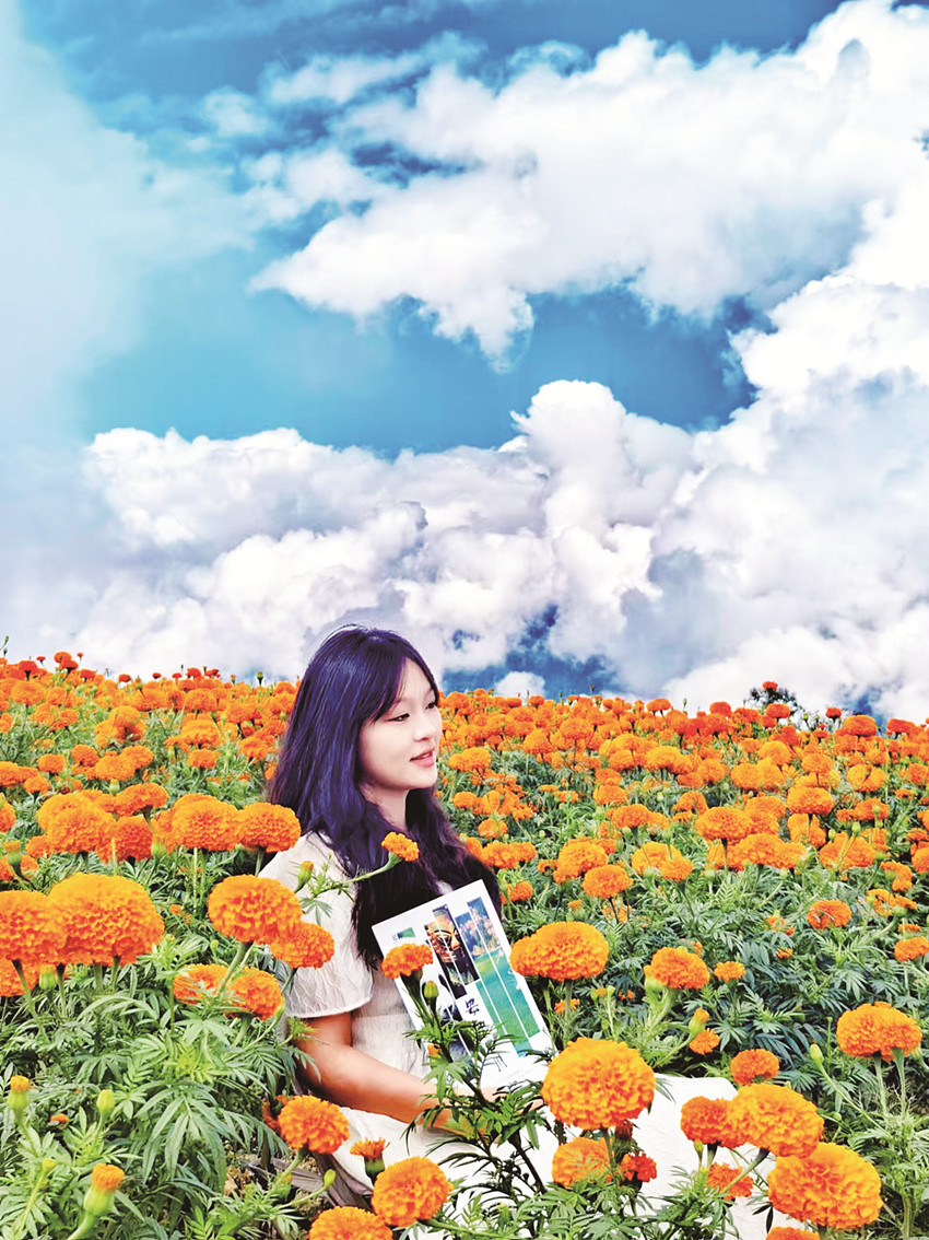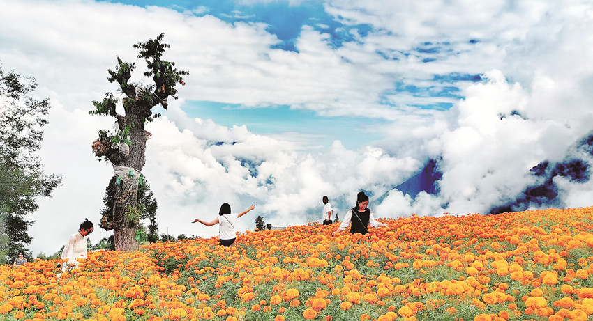 在這金風(fēng)送爽的秋日,瀘定德威加郡海子村18萬(wàn)株萬(wàn)壽菊競(jìng)相綻放,漫步在花海之中,人們可以感受秋風(fēng)的輕撫,呼吸清新的空氣,寧?kù)o的村寨依托著貢嘎雪山、藍(lán)天白云,在成片的萬(wàn)壽菊裝點(diǎn)下構(gòu)成了一幅亮麗的鄉(xiāng)村畫(huà)卷。