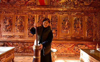 道孚民居的精華在其內(nèi)部,木材是其唯一的內(nèi)部裝飾材料,而裝飾,是一項繁瑣得曠日持久的藝術(shù)勞作,往往建房只需一兩個月,內(nèi)部裝飾則要幾年甚至幾十年。民間建筑藝術(shù)家們沉醉在細(xì)致入微的勞作里,讓每一個圖案都盈溢一份心底的吉祥,讓每一筆描摹都傳遞一份動人的傳說。房間四壁、房門和梁柱上一般都繪滿了精致典型的藏式壁畫,窗上分別雕刻著龍、鳳、仙鶴、麒麟等吉祥圖案。每間屋的大門上都鑲嵌醒目的兩個獅頭大銅環(huán),凸顯了與之相融的漢文化的特點。置身其間,色彩斑斕中,身邊盡是龍飛鳳舞,鶴翔麟躍。繽紛中細(xì)端詳,真是藏民族藝術(shù)的天堂!