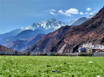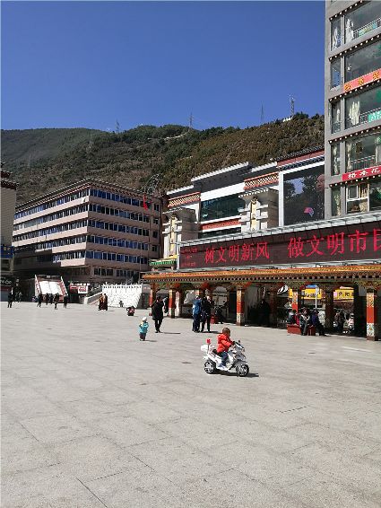 天空像剛被浸染的綢緞,蔚藍(lán)的主色已經(jīng)略顯;白雪好似從浸染的綢緞上滴落下的顏料與其它顏色的混合,眷戀的駐足在山尖,在其耳旁傾訴來年的約定;一顆顆萬年青穩(wěn)穩(wěn)的站立,將山中的寺廟、亭閣緊緊地包圍,見證著康定四季輪回的變化;依然披著秋冬贈予黃色外衣的樹木,拋開桎梏,堅守在一座座樓房旁。藍(lán)與白,黃與綠……這大美的晴天為人們帶來了別樣的視覺盛宴。