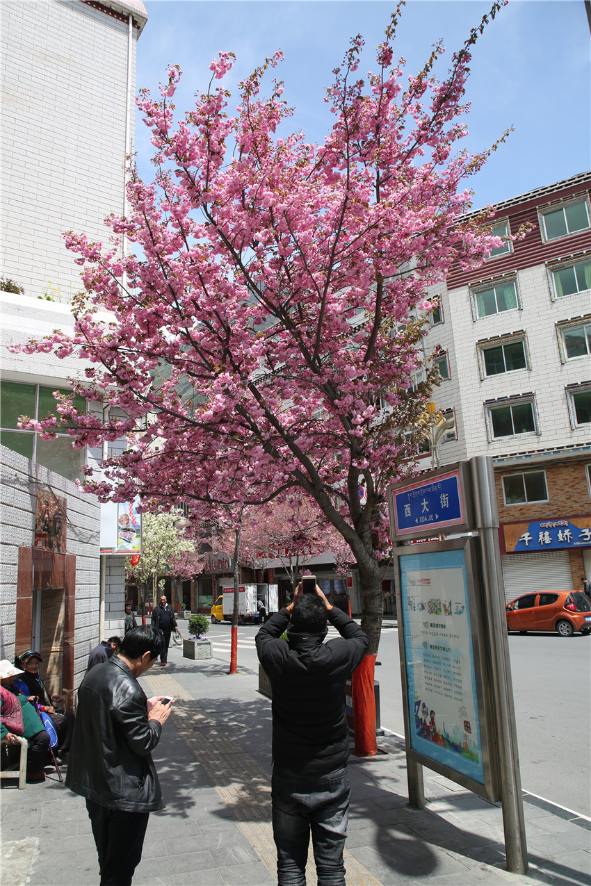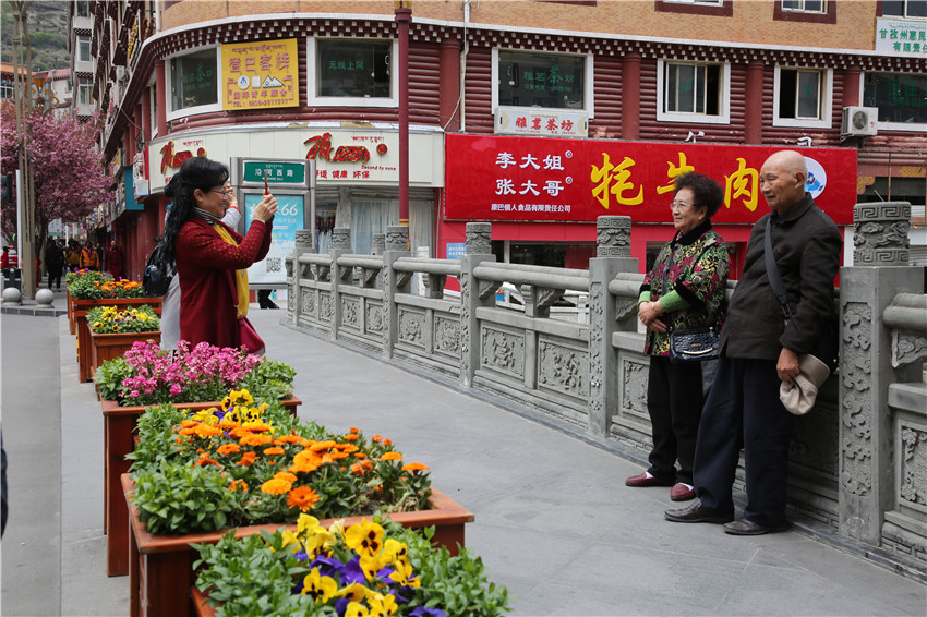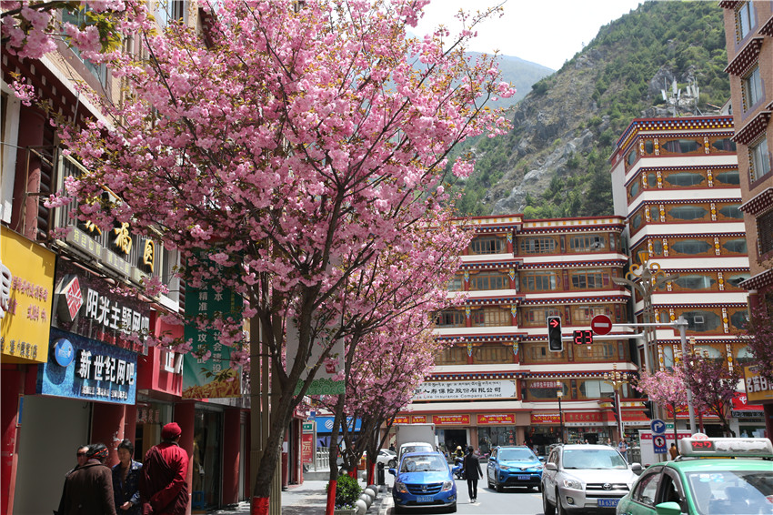 當(dāng)春天遇見(jiàn)最美的櫻花時(shí),驚艷了整個(gè)康定。櫻花與身邊人都將成為春日里的浪漫風(fēng)景。櫻花之美,美在氣勢(shì),櫻花紛飛,夢(mèng)幻唯美。每年4月中旬,康定城北門的櫻花綻放后,人們像是約好了一樣聚集到這里,共赴這一場(chǎng)甜美盛宴。這一路繁花似錦,人們穿過(guò)枝椏花正盛的櫻花林,穿過(guò)粉色海洋,徑直奔向一個(gè)浪漫的童話,一路櫻花飄散,一路粉光燦爛。櫻花絢麗繽紛、陸續(xù)綻放,若恰逢一陣春風(fēng)經(jīng)過(guò),櫻花瓣隨風(fēng)舞動(dòng),猶如紛落的雪花,空氣中浮動(dòng)著櫻花特有的淡淡香氣,令人不禁懷疑自己置身夢(mèng)境?!翱刀ǖ拇禾靵?lái)得要晚一些,綻放的櫻花,滿街的花草,折多河畔楊柳依依,康定的春天無(wú)比驚艷,醉了游人?!敝芟壬贿吪恼眨贿吀袊@,他在康定生活了40多年,20年前的康定,可以說(shuō)找不到像樣的花草樹(shù)木,進(jìn)入新時(shí)代,康定城市變美了,城市綠化走在了前面,城市的美譽(yù)度舒適度不斷提升??刀ㄖ海荷珴M園,姹紫嫣紅,風(fēng)光旖旎。