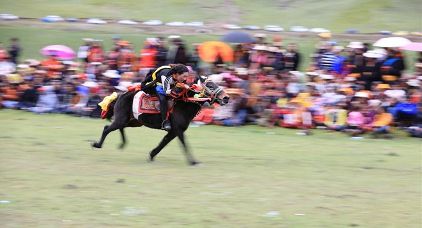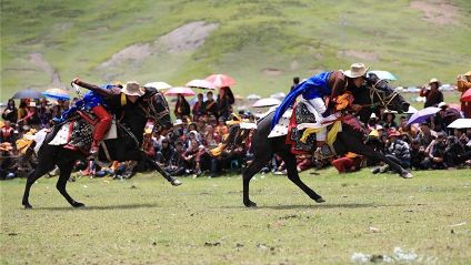 7月23日,四川甘孜藏族自治州理塘縣村戈鄉(xiāng)賽馬活動(dòng)開始,牧民們?cè)隈R背上一顯身手。每年藏歷六月,當(dāng)草原上格桑花盛開的時(shí)候,四川省理塘縣24個(gè)鄉(xiāng)(鎮(zhèn))就會(huì)按照習(xí)俗舉辦隆重的賽馬會(huì)來(lái)拜祭神山,慶祝豐收。迄今有400多年歷史的賽馬分為耐力賽、小走賽、馬術(shù)賽等,其中最為精彩的是馬術(shù)賽:馬肚藏身、馬背倒立、飛騎射擊、拾哈達(dá)等,驚險(xiǎn)刺激。2008年6月,此項(xiàng)活動(dòng)被列入四川省級(jí)非物質(zhì)文化遺產(chǎn)保護(hù)項(xiàng)目。(朱虹 葉強(qiáng)平)