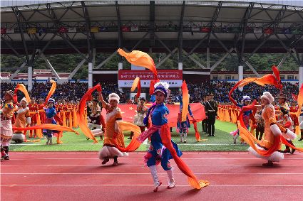 “本屆少數(shù)民族傳統(tǒng)體育運(yùn)動(dòng)會(huì)的會(huì)徽以格薩爾王賽馬登位為基本形象,由字母‘SC’組成的騎手代表‘四川’,數(shù)字‘15’組成了昂揚(yáng)奔騰的‘馬’為主體的形象,代表‘15屆民運(yùn)會(huì)’。這既有藏民族特色,又顯得美觀大方?!痹陂_幕式現(xiàn)場,來自杭州的陳琳興致勃勃地說。