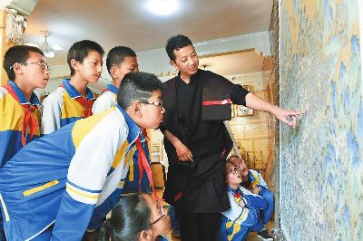 著著是當(dāng)?shù)匦∮忻麣獾漠嫀煟?4歲從臨摹、勾線定型、著色染色開始學(xué)起,3年后就出師獨(dú)立作畫。17年時(shí)間,他繪制了3000多平方米的壁畫和數(shù)百幅唐卡,光筆就畫禿了20000多支。去年,著著憑借《南絲路一帶緣藏漢人一家親》成為當(dāng)年文藝界最高獎(jiǎng)山花獎(jiǎng)的獲得者。今年,他圍繞“一帶一路、藏漢和睦”為主題而創(chuàng)作的大幅唐卡畫作也即將收尾。