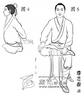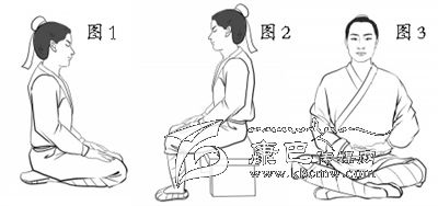 平坐。漢代以前,古人大多采用平坐,即以膝居地,小腿平置于地,臀部貼于腳后跟,就像跪坐一樣(圖1)。不管是在地板上,還是在床上,都采用這種坐法。平坐又叫正坐、安坐等,坐時身體挺直,眼睛平視,是最體面、權威的坐法。