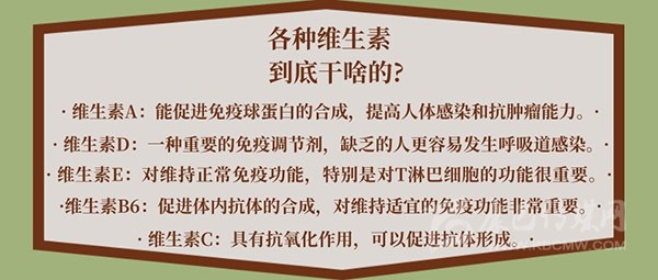 維生素A能促進免疫球蛋白的合成,提高人體感染和抗腫瘤能力;維生素A還能消除免疫耐受。影響免疫反應(yīng)的各種細胞因子也可能在維生素A缺乏時發(fā)生改變,從而影響體內(nèi)抗原-抗體反應(yīng)。