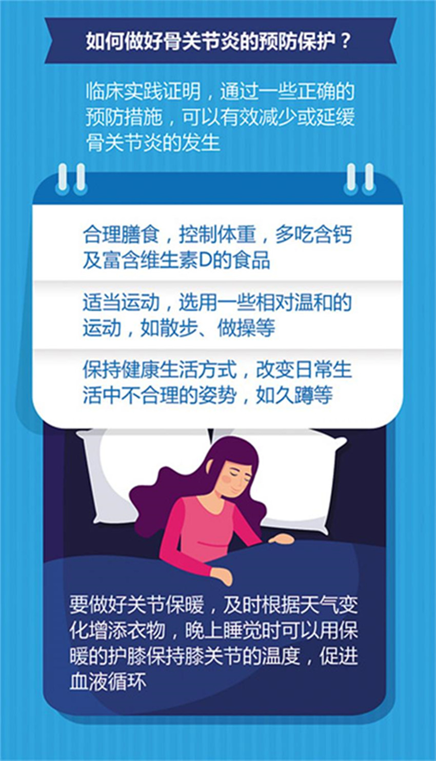 “首先是合理運(yùn)動(dòng),包括運(yùn)動(dòng)形式與節(jié)律?!彼窝蠼榻B,有患者認(rèn)為得了關(guān)節(jié)炎就不能運(yùn)動(dòng)了,實(shí)際上,不運(yùn)動(dòng)反而會(huì)導(dǎo)致肌肉萎縮和骨質(zhì)疏松,對(duì)關(guān)節(jié)不利。適量、正確的運(yùn)動(dòng),不僅不會(huì)加重軟組織的損傷或關(guān)節(jié)炎癥,還會(huì)加強(qiáng)關(guān)節(jié)的穩(wěn)定性,預(yù)防關(guān)節(jié)軟骨的進(jìn)一步損傷,減輕關(guān)節(jié)炎的癥狀,延緩關(guān)節(jié)功能退化。他強(qiáng)調(diào),要避免爬樓梯、爬山、深蹲等對(duì)關(guān)節(jié)壓力較大的活動(dòng),推薦一些中等強(qiáng)度的運(yùn)動(dòng)形式,例如散步、慢跑、游泳、騎自行車等。在運(yùn)動(dòng)節(jié)律上,推薦養(yǎng)成規(guī)律運(yùn)動(dòng)的習(xí)慣,避免“沖擊劑量”體育鍛煉,特別是步入中年后、長(zhǎng)期伏案工作的人群,一次突然的大劑量運(yùn)動(dòng)可能對(duì)關(guān)節(jié)造成嚴(yán)重的傷害。