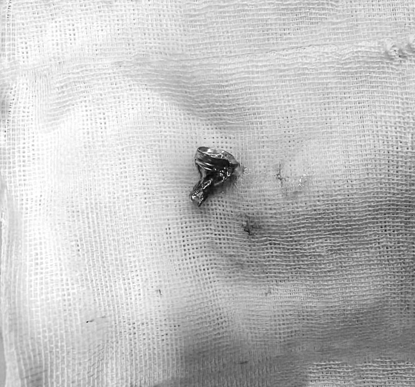手術(shù)于1月5日13時開始,在醫(yī)院呼吸與重癥醫(yī)學(xué)科、消化胃腸鏡室的支持下,兒科與麻醉科醫(yī)護(hù)人員密切合作,兒科醫(yī)生劉勤、張雪瓊冷靜操作、沉穩(wěn)手術(shù),最終將異物成功取出。經(jīng)仔細(xì)檢查,異物為一扭曲變形的鉛筆頭鋁箍。