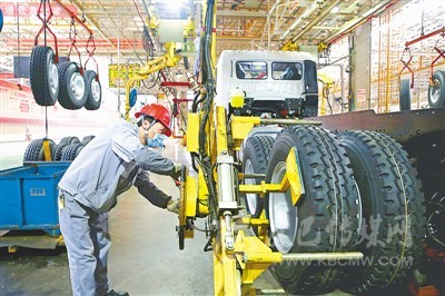 自復(fù)工以來(lái),安徽馬鞍山市經(jīng)開區(qū)內(nèi)的華菱星馬汽車集團(tuán)一手抓疫情防控,一手抓生產(chǎn)和市場(chǎng),各項(xiàng)工作順利推進(jìn),產(chǎn)能完全恢復(fù)到疫情發(fā)生前水平。圖為工人正在安裝輪胎。
