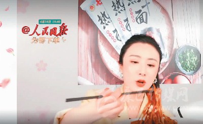 在人民日?qǐng)?bào)新媒體“為鄂下單”系列直播湖北團(tuán)圓專場(chǎng),網(wǎng)紅主播正在展示湖北特色食品熱干面。