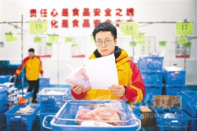 陜西黃馬甲物流配送股份有限公司生鮮中央工廠的工作人員認真核對供應鏈產(chǎn)品。