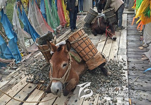 這是318和317國(guó)道都不通過(guò)的甘孜州白玉縣,從白玉縣城通往建設(shè)鄉(xiāng)德沙村的路是一條木制棧橋,2014年5月4日的中午,兩頭騾子在300斤石料的重壓下踩斷了中間的橋板,兩條前腿從踩碎的木板處懸著,騾子發(fā)出粗壯的喘息聲,無(wú)法掙扎,不能動(dòng)彈。棧橋上有路過(guò)的藏民,手中旋轉(zhuǎn)著轉(zhuǎn)經(jīng)筒,他口中念念有詞:騾子啊,你還沒(méi)有得到解脫。一群來(lái)自外地的游客都很驚詫。 騾子運(yùn)輸隊(duì)的王玉海,在過(guò)往行人和同行的騾隊(duì)鄉(xiāng)親的幫助下,先卸下騾子身上背負(fù)的碎石,然后手伸到騾子前腿根處,用力抬起騾子的前身。在查看騾子沒(méi)有受傷后,王玉海把這兩只騾子牽到騾隊(duì)最后面,然后,引著另外5只負(fù)重的騾子,從橋靠左邊的雙層木板橋面上通過(guò),騾子隊(duì)受到驚嚇,不愿意上橋,王玉海安撫了一會(huì)兒騾子隊(duì)后,在同伴的協(xié)作下,前面牽引,后面驅(qū)趕,終于,王玉海的7只騾子過(guò)橋,其他8個(gè)同伴的50多頭負(fù)重的騾子也一一通過(guò)。