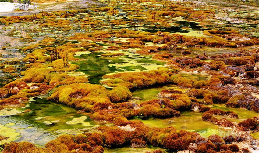 灘長(zhǎng)約3000米,寬約200米,共有7個(gè)臺(tái)階,上面形成了大小不一的彩池,里面的各類水生植物,暢游的羌活魚(小鯢)等,給這片古老的地質(zhì)奇觀帶來了無限的生機(jī)。在海拔4300米處,有一眼噴出1.5米高的溫泉,水溫常年在30度左右,是玉龍泉華灘的主要水源。
