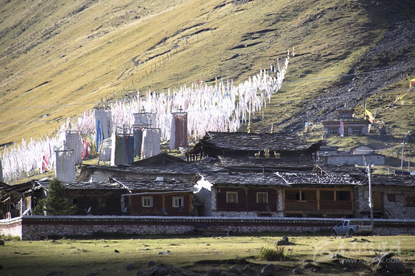 當太陽落進金龍雪山的懷抱,最后一抹余暉斜照在靜靜的莫斯卡村莊上。東邊的小河在斜陽里歡快的流過村莊,莫斯卡的女人在夕陽里,正領(lǐng)著孩子回家。西邊牧歸的男人悠閑的向山下趕著牦牛。村莊背后漫山的經(jīng)幡,在晚風(fēng)里誦經(jīng)祈福……格薩爾王的傳說就在這樣的時光里,雕琢成了漫山的石刻,在經(jīng)年的歲月里傳頌。