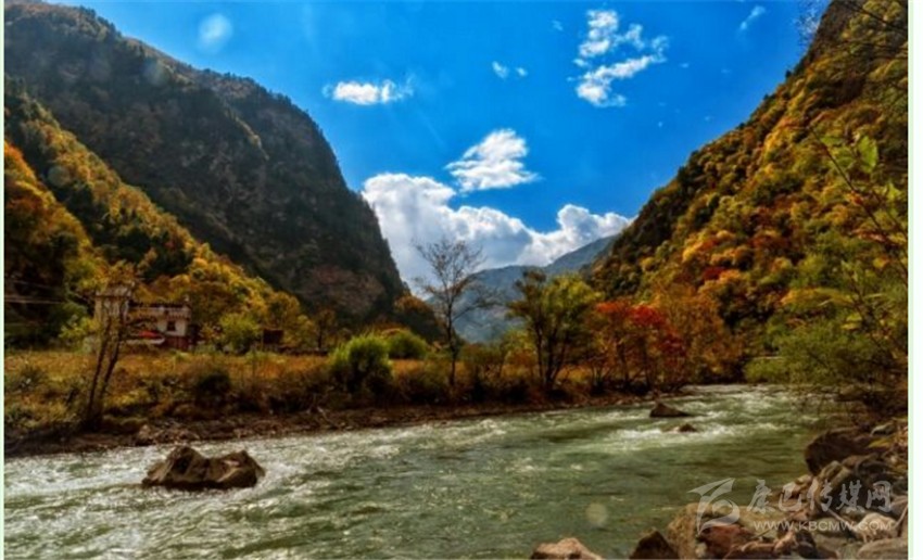 東谷河原名牦牛河,在丹巴縣五個主干水系中,它是最小的一條,兩岸多為峽谷地貌,僅在支溝匯合處出現(xiàn)有平壩草地。在陡峭高聳的河谷兩岸,針闊葉混交林呈現(xiàn)出深淺不同的綠色,既有青黛,墨綠,又有嫩綠,草青及四季輪番開花的不同品種的大小杜鵑。還不時有珍禽出沒。每當秋高氣爽的季節(jié),一團團,一簇簇的紅葉伴隨杜鵑花在林間綻放,伴以宛轉的啾啾鳥嗚;河水清澈明亮,時而奔騰而下,形成飛瀑,時而伴著叮咚之聲潺潺而過,這種美景何處能有?老革命家胡耀邦同志游覽后,對此青山綠水贊不絕口,并稱之為“天然盆景”!盆景藝術一向以“無聲的詩詞,立體的畫卷”來形容。牦牛谷景點正是一個有著巨大篇幅的詩詞,一個有著廣闊的立體畫卷。