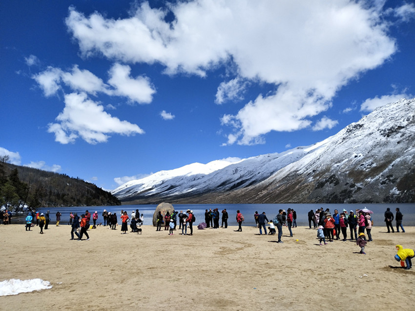 4月30日,筆者來(lái)到木格措景區(qū),看到售票大廳內(nèi)人頭攢動(dòng),人氣火爆,游客有序的在窗口前、觀光車站前排隊(duì)等候,公安民警、景區(qū)管理人員在值勤巡邏,為前來(lái)咨詢的游客進(jìn)行講解、帶路。
