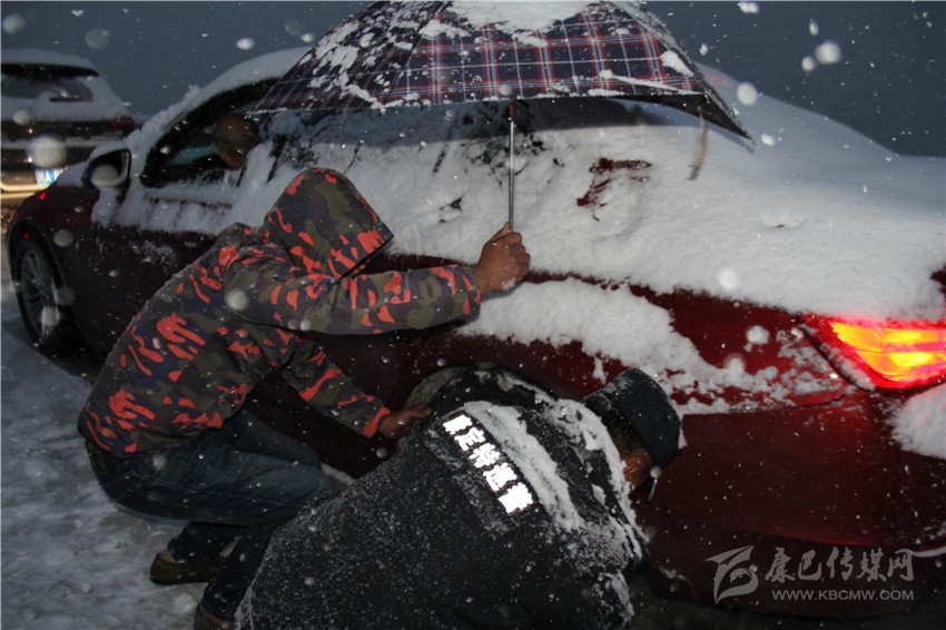 抗雪保暢中,警察為游客掛鏈條。