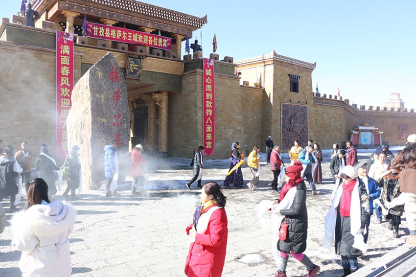 寒風(fēng)不減游興,冬日游王城別有一番風(fēng)情,游客們徜徉在格薩爾王城獨(dú)特建筑中,游覽了嶺國圣泉、千年神石、卓陵湖、格薩爾祈愿地、阿尼瑪卿雪山、阿克晁通寨子、更嘎尼瑪寨子等景點(diǎn),并親自體驗(yàn)景觀小品,每到一處大家都會用手機(jī)記錄下精彩瞬間,有的曬個朋友圈、發(fā)個抖音小視頻,有的干脆在王城里來個直播,領(lǐng)略格薩爾文化的魅力。