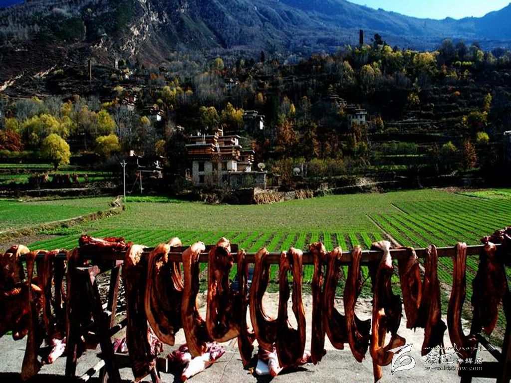丹巴嘉絨藏族年期間,在酸菜包子、火燒饃、香豬腿等眾多的風(fēng)味飲食中,“藏香豬腿”是必不可缺的美食佳肴,也是給長(zhǎng)輩拜年和親朋好友間互送的最佳禮品。“藏香豬腿”的制作方式也象丹巴嘉絨藏族年一樣的獨(dú)特。丹巴人宰殺年豬的方式通常有用繩索死吊或者用刀從勁入殺心臟致死兩種,現(xiàn)在采用后一種方式宰殺豬居多。當(dāng)?shù)厝藢⒇i宰殺后用熱水燙,處理好豬毛,再在胸口用刀開一孔,將手伸人胸腔扯斷心肺連接處,然后將其剖開,并把肥、瘦豬肉分離開,剝?nèi)グ逵?,處理好其他?nèi)臟,將豬腿按原形分離,爾后經(jīng)霜凍、柏枝熏、自然風(fēng)干后存放在儲(chǔ)藏室內(nèi)。豬腿存放一冬后,色、香、味俱佳。食用時(shí)煮成半熟或用炭火將表皮烘烤,切成小塊狀或撕成粉絲狀,在百米內(nèi)即可聞到香味,入口鮮嫩清香,營(yíng)養(yǎng)豐富,誘人食欲。