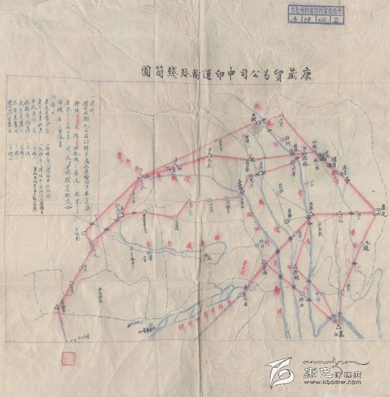 在很多人的印象中,所說的“茶馬古道”僅是從四川的雅安到康定,然后從康定到青海牧區(qū)和西藏拉薩。事實上,這條古道直達印度。在塵封的檔案中發(fā)現(xiàn)一份“康藏貿(mào)易公司中印運輸路線簡圖”,清晰地標明從康定往西走直到印度加爾各達等地的商品運輸線路。