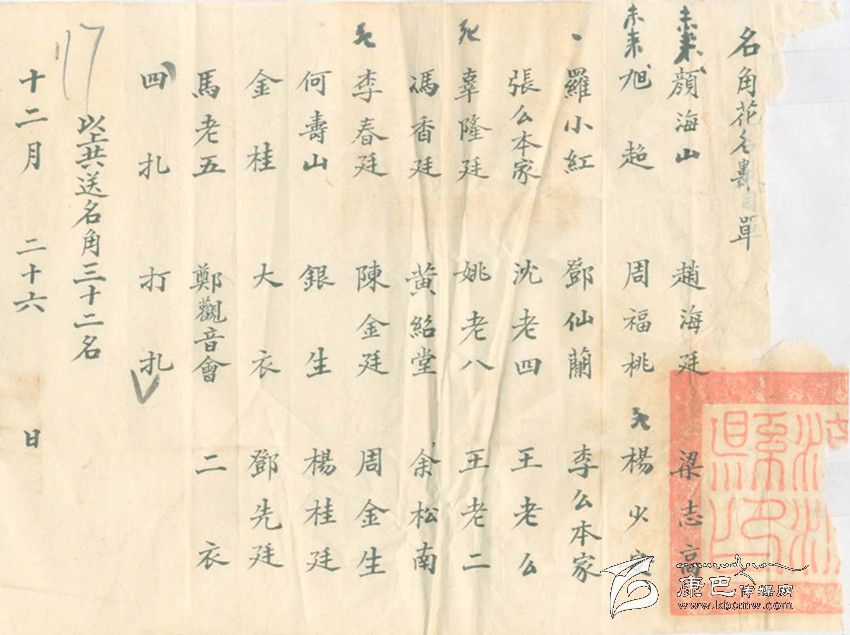 不準(zhǔn)賭博做什么呢?當(dāng)時(shí)的當(dāng)權(quán)者還是費(fèi)了一番心思,他們從外地請(qǐng)來了一個(gè)川戲班子,為了吸引人們關(guān)注,康定縣政府把戲班的名角以及配角演員名單寫成海報(bào)張貼到街頭,又抄成傳單廣為散發(fā),用現(xiàn)在的話說是,做足了戲班出場(chǎng)前的前期宣傳工作。從名單上看,這是一個(gè)不小的戲班子,所謂名角竟有32名之多。想來對(duì)于沒有多少文化生活的康定民眾,還是有一定的吸引力。