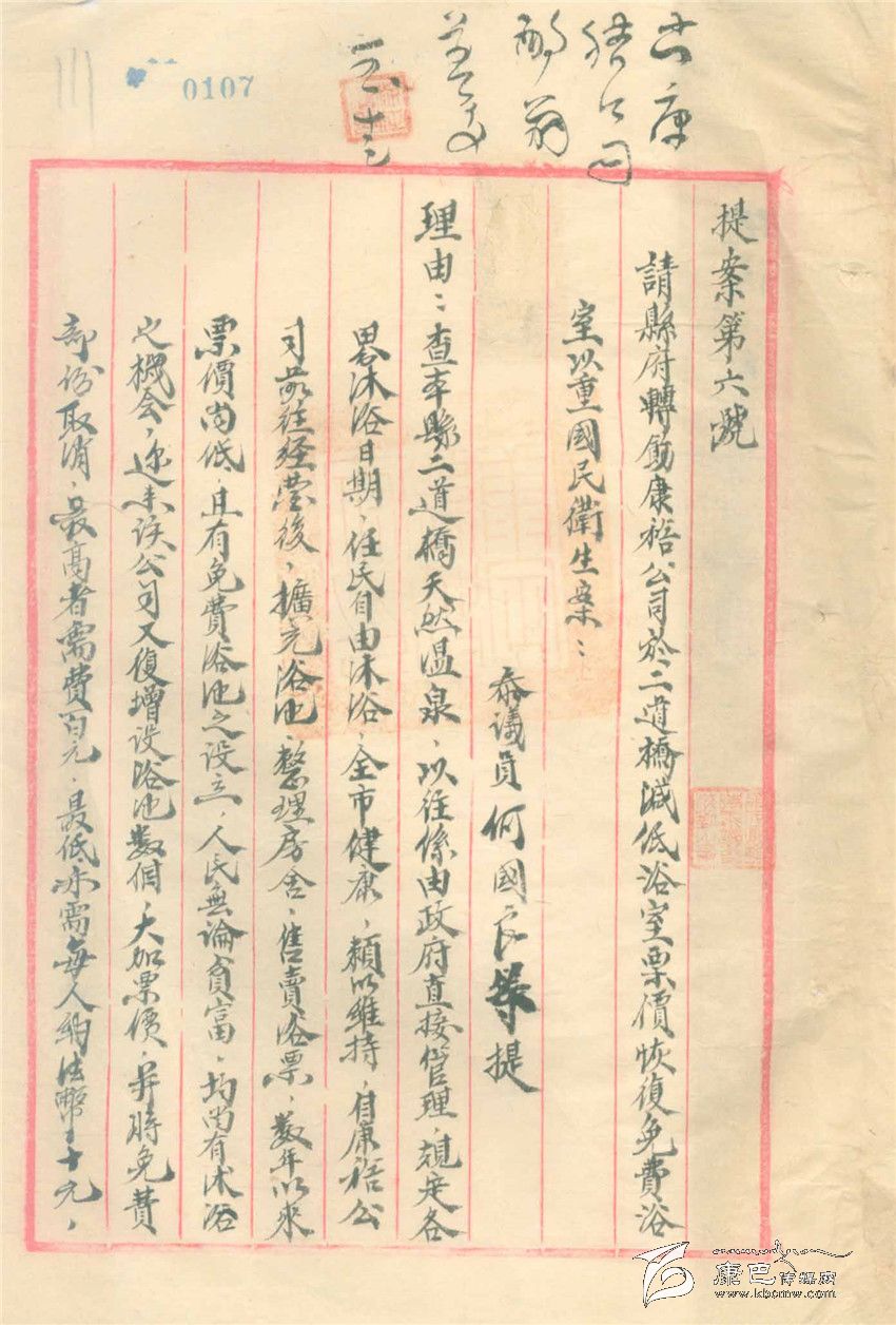 另一份舊檔案也有趣,這是一份由一名參議員提出的提案,內(nèi)容是由于生活在康定的人、包括公務(wù)人員在內(nèi),因?yàn)槭杖肷?,生活困難。請(qǐng)求康定縣政府出面給經(jīng)營(yíng)二道橋的“康裕公司”提出二道橋洗浴不收費(fèi),經(jīng)營(yíng)方的虧空可以在其它經(jīng)營(yíng),如餐飲獲得的利潤(rùn)中解決。參議會(huì)上還通過了這個(gè)提案,說是“原案所擬辦法尚屬可行,擬送請(qǐng)縣府轉(zhuǎn)飭康裕公司照辦”。這份提案再無下文,康裕公司是不是照辦了,不得而知,就是參議會(huì)是不是轉(zhuǎn)給了康定縣政府也不得而知。以今天的眼光看,這份提案有滑稽、有趣的一面,卻也有關(guān)注民生而十分無奈的一面。