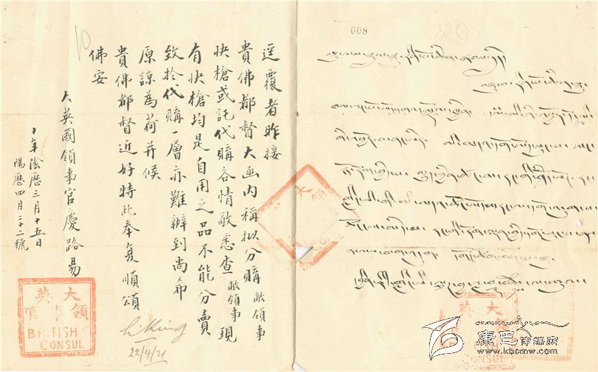 可以肯定的是,這就是給某位活佛的復(fù)信,除了稱(chēng)呼佛都督(這是在當(dāng)時(shí)對(duì)活佛的通行的敬稱(chēng))可以看出外,還有藏文可以佐證。這張紙片上寫(xiě)道:昨接貴佛都督大函,內(nèi)稱(chēng),擬分購(gòu)敝領(lǐng)事館快槍或托代購(gòu)各情敬悉。查敝領(lǐng)事現(xiàn)有快槍均是自用之品,不能分賣(mài)。致于代購(gòu)一層,亦難辦到,尚希原諒為荷,并候貴佛都督近好,特此奉復(fù),順頌佛安。署名是大英國(guó)領(lǐng)事館官慶路易,日期為十年陰歷三月十五日,陽(yáng)歷四月二十二日。在公章下面注有公元1922年4月22日。