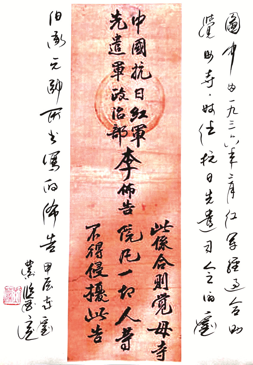 紅軍在合則覺母寺的布告,從1936年3月我父親任中國工農(nóng)紅軍抗日先遣軍司令、布告的書法與此后的書法絕然相似,結(jié)合紅軍和平進駐甘孜的史實等因素,進行綜合分析,我認為此布告為我父親劉伯承所寫。