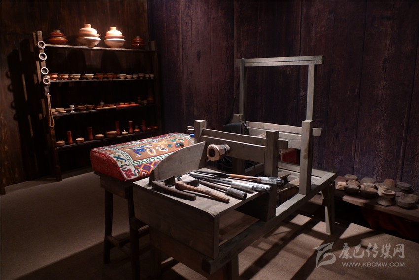 一處古色古香的展柜上,各種藏式木制茶具、碗散發(fā)著古老質(zhì)樸的氣息,天然的花紋自然流暢,色澤婉轉(zhuǎn)溫厚。距離展柜較近的地方,兩架可手工操作的藏式木制機器有規(guī)律地運轉(zhuǎn)著,來自得榮的格絨次仁父子正在機器上演示藏式木碗的制作過程。