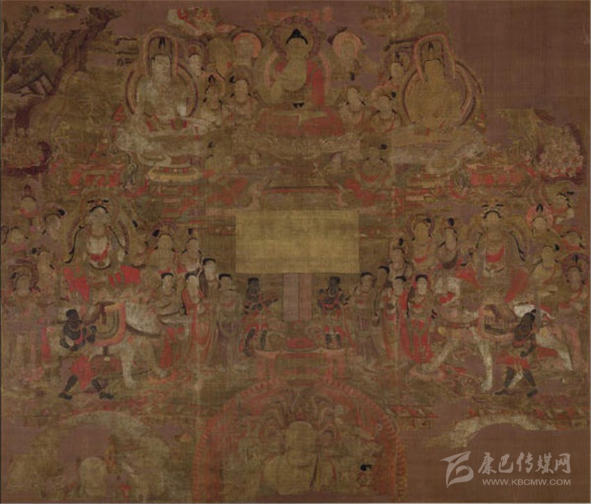 公元十三世紀,印度波羅王朝覆滅。佛教中心超戒寺被毀,大量的佛教藝術(shù)家和工匠逃到了尼泊爾馬拉王朝,所以尼泊爾的藝術(shù)是從這個時期開始發(fā)展強大的,這相當于是“藝術(shù)的接棒”。尼泊爾的繪畫風格,就沒有石窟的概念了,透視立體也逐步被消解,然后用卷草等紋樣填滿背景,畫面變得平面化、精致化了。