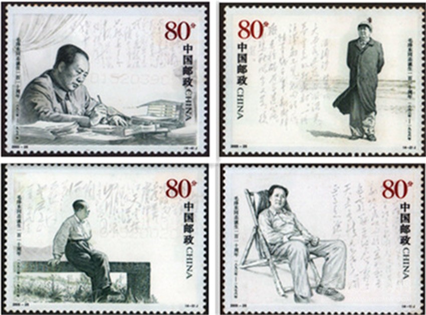 2003年12月6日, 中國(guó)郵政發(fā)行《毛澤東同志誕生一百一十周年》紀(jì)念郵票一套4枚,分別表現(xiàn)了毛澤東在西柏坡、毛澤東在北戴河、毛澤東在廬山、毛澤東在廣州的不同形象,背景以相應(yīng)的毛澤東詩(shī)詞書(shū)法襯托,偉人的豐姿躍然票上。這套以照片為基礎(chǔ)采用膠雕套印大票面黑白兩色的郵票,樸素大方,典雅大氣。郵票中的人物形象從面部表情到坐立姿態(tài),都顯出神采奕奕、栩栩如生。