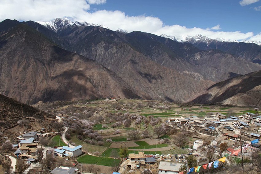 我和張柯在村子里轉(zhuǎn)悠了十多分鐘,也沒(méi)有見(jiàn)到一個(gè)人。我們只好到田野里瞎轉(zhuǎn)。斜達(dá)村的海拔有3305米,在這里可以俯瞰下面山谷對(duì)面的江坡村。因?yàn)楹0胃撸N的都是旱地,地里的青稞才有一尺高。我們從田埂上走過(guò)去,一只碩大的母雞帶著10多只小雞唧唧咕咕的在田地里覓食。我們走到村邊山頭上,放眼望去,對(duì)面的卡瓦格博群山放射著萬(wàn)道金燦燦的霞光,盡顯山之王者的威儀。下面的山谷里,蘭色的炊煙如帳幔般飄拂,好一副山野美景!