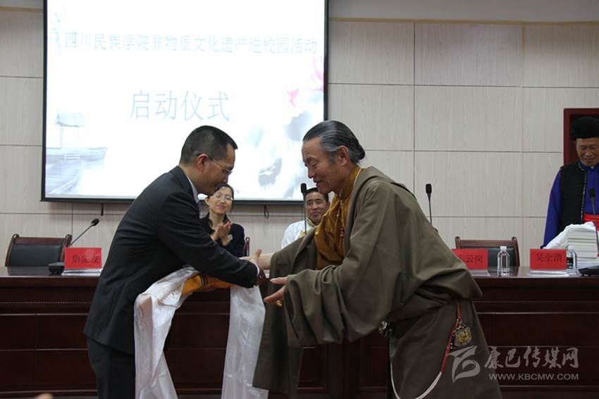 現(xiàn)場,世界非物質(zhì)文化遺產(chǎn)《格薩爾》說唱傳承人阿尼、州級非物質(zhì)文化《瀘定山歌》代表性傳承人吳全清分別將自己在非物質(zhì)文化遺產(chǎn)研究過程中撰寫的經(jīng)文、書籍贈送給學院。此外,省級非遺文化嵐安鍋莊代表性傳承人黃能貴、音樂舞蹈學院教師邱敏作為代表發(fā)言。