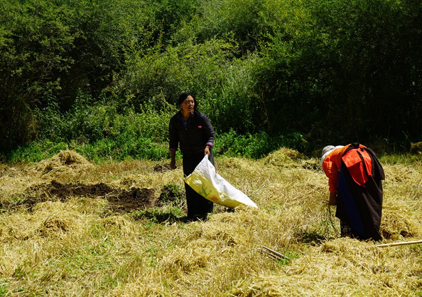 開始收割了,從坡地到川地,到處是收割機(jī)的聲音。青稞是車巴溝的主要作物,因?yàn)橐デ囡?,要吃糌粑。村里人忙得團(tuán)團(tuán)轉(zhuǎn),收割機(jī)開過去,大家就跟在后面撿穗子。如此往復(fù),一直要到糧食拉到家里。