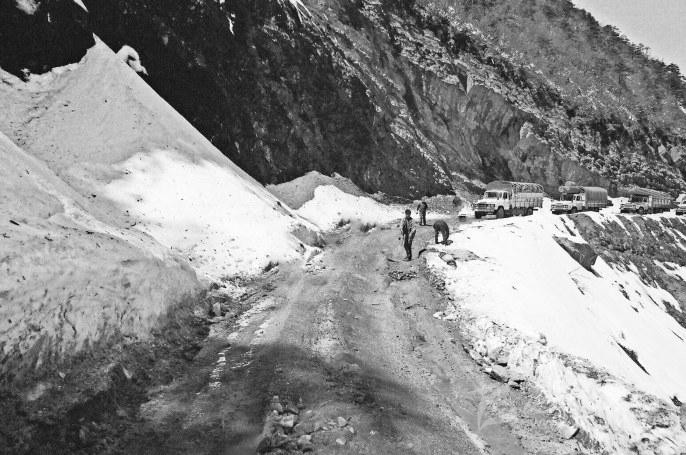 直到上世紀(jì)的七八十年代,人們要翻越二郎山,無(wú)疑還是把腦袋別在褲腰帶上的冒險(xiǎn)之旅,彎急、坡陡、路窄、高反,再加泥濘濕滑,尤其艱難的是上半山那段路,兩道深深的車(chē)轍坑槽,車(chē)輛只能沿車(chē)轍上山,蝸牛般爬行,離開(kāi)坑槽就意味著死亡,遇上錯(cuò)車(chē)誰(shuí)都不愿冒險(xiǎn)出槽,越“雷池”一步。車(chē)速要快快不起來(lái),想慢慢不下去,拿駕駛員們的話(huà)說(shuō)就是:上山把踩油門(mén)的腳蹬進(jìn)了油箱,車(chē)子跑不快,下山那怕是剎車(chē)踩死,車(chē)子還是停不下,堵車(chē)成家常便飯,拋錨隨時(shí)會(huì)有發(fā)生。