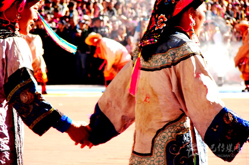 在婦女面前,腰部以下直達腳踝處,有寬約二十厘米左右的條狀絲綢布料,藏語稱為“仲巴”。這一條狀服飾,面料全部用絲織品制作而成。上面的圖案多為牡丹、杏花等花卉,也有龍虎、麒麟、雙龍、鳳凰等圖案的。裙擺外沿用絲織品鎖邊,絲織品上多有云紋,也有鮮花刺繡。顏色的搭配較為鮮艷,與中間的主題圖案之間形成一種強烈的對比,讓服飾之間的主次一目了然。