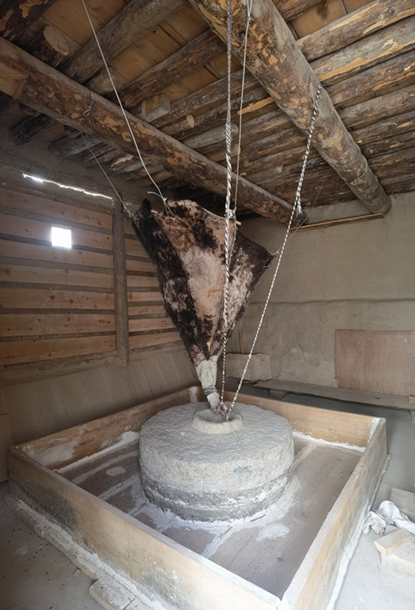 一條約三米寬的水渠橫穿眼前,水渠在側(cè)面依次開了七個口子。上游三個用來排水,冬天用隔板擋著,夏天則用來泄水。中游三個口子都是磨坊的動力來源。走進去是一處水磨坊,三座半徑約0.8米的石磨間隔1.7米一字排開。頂端是牛皮制成的青稞喂料器,由四根繩子系在房間頂角的不同方向;尾端是由牛角制作的喂料嘴,略顯復雜的繩拉式調(diào)節(jié)器錯綜復雜,但卻精妙無比地控制著青稞的出料速度。