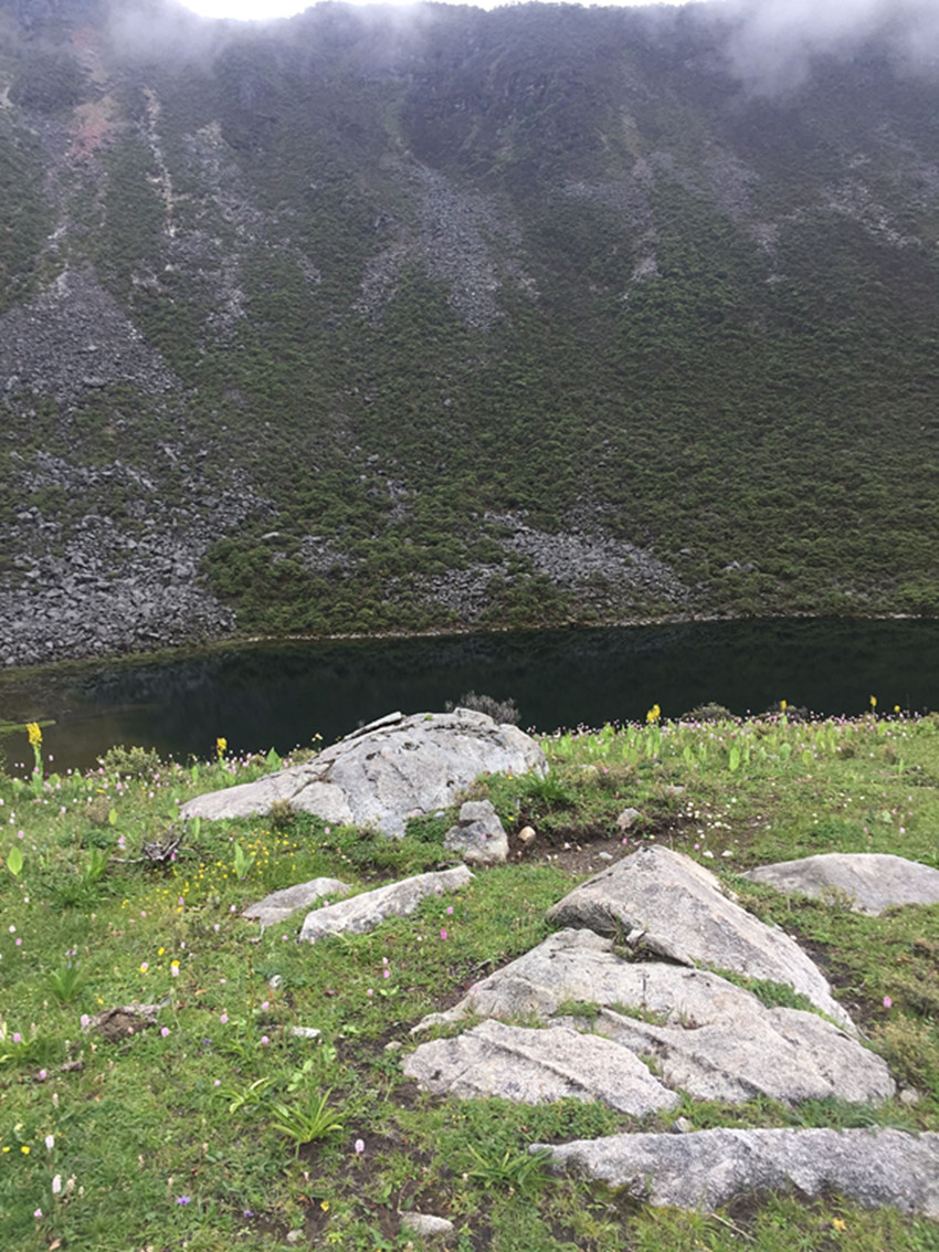 銀珠聽到南吉即興唱出的山歌那么溫婉動(dòng)人,被風(fēng)吹冷的眼睛里落下了兩顆溫?zé)岬臏I水。她掩飾住自己的情緒,從粗重的呼吸里回答:“好?。 蹦霞牭姐y珠對(duì)唱,臉上綻放出笑容。她們的腳底不再發(fā)出響聲的時(shí)候,就是已經(jīng)走到了兩座大山之間的那片山谷。一層淺雪里露著青草、一叢叢開紫花的小杜鵑,還有密密匝匝的矮腳柳。銀珠站在一塊土包上,她打開雙臂,一臉明媚地對(duì)著南吉說(shuō):“阿姐,這片沒(méi)有積雪的山谷就是我送給你的禮物?!?/span>