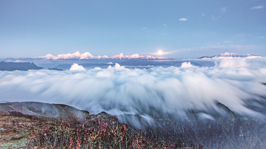 這是天上貢嘎寬大為懷、兼容并包的不凡氣度。它以獨(dú)具魅力和氣吞山河的雄偉壯麗,以及無法憾動(dòng)的王者之軀,包容并呵護(hù)著無數(shù)群峰、千溝萬壑、萬物生靈和諧共生共處,展現(xiàn)出一幕幕眾山拱衛(wèi)下精致的山岳大戲。如此這般,既把自身推向了高點(diǎn),又使依偎在身邊甚至遠(yuǎn)處的萬物生靈各得其所、各展其長(zhǎng)、各有所獲。