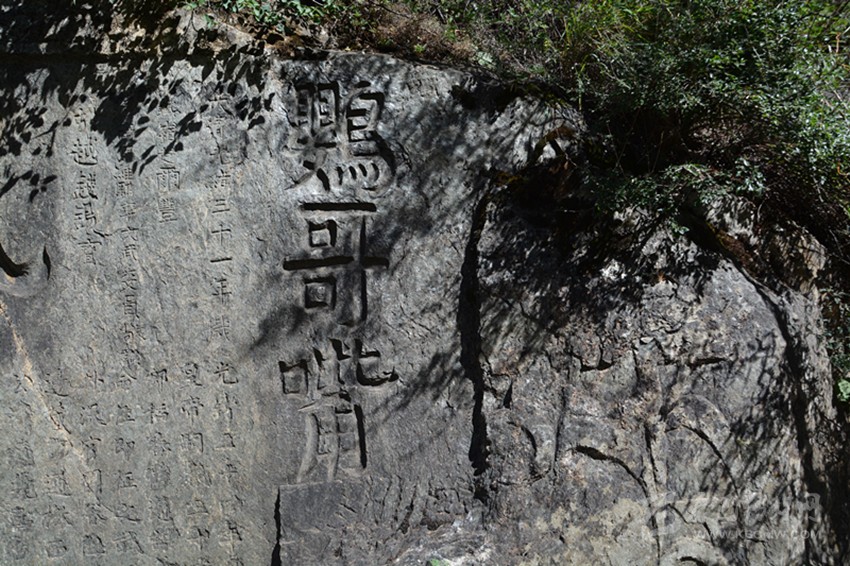 《竺國通衢》刻在一顆大石頭的下部,石高約三米,長約六米,刻于清道光年間,意為通向印度的通道,充分說明這條道路的價值和作用。大石和字已藏在核桃樹下,勢大必難除,加之雨水侵蝕下已風(fēng)化嚴重。
