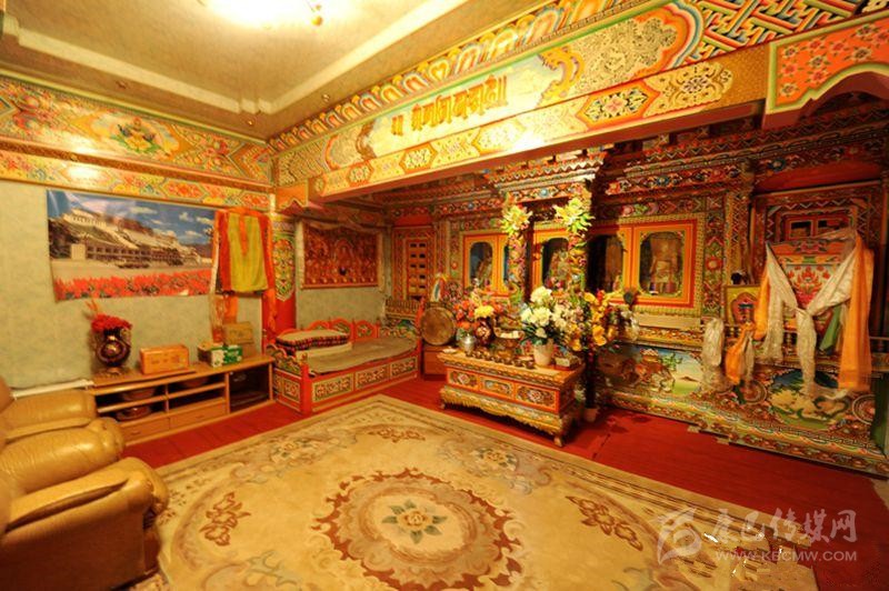 藏族居室一般分臥室、客廳、經(jīng)堂和廚房等部分。室內(nèi)陳設(shè)與裝飾如藏式建筑學(xué)者葉啟燊所言:“主次分明,重點(diǎn)突出。主室較為復(fù)雜而樸素,經(jīng)堂偏于華麗而清幽,其余各室均較簡(jiǎn)單。室內(nèi)都不施粉刷,但有個(gè)別的經(jīng)堂作雕刻裝飾;土司和喇嘛上層的經(jīng)堂則會(huì)作油漆的彩畫。”藏區(qū)不論是農(nóng)牧民住宅還是貴族上層府邸都有供佛的設(shè)施,經(jīng)堂屬于凈地,是專門供奉神佛的,因此,一般不作他用;主室是藏族住宅中最重要的一個(gè)房間,也是功能最多的房間,其中有生活、睡眠、飲食等所需的爐灶、壁櫥、壁架、矮桌、火盆等。這些藏式家具的布置安放,早已形成一定之規(guī)。