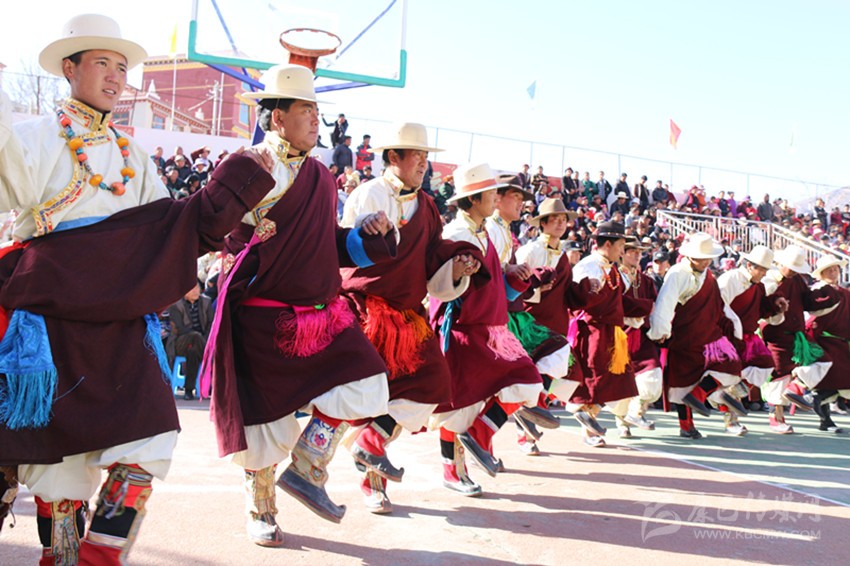 弦子比賽開始了。精神矍鑠,頭戴紅須“嗦啊”的扎西第一個(gè)出場。白色“仙子”(藏式襯衫)的長袖一層層疊到手腕,藍(lán)緞子藏式背心在陽光的映襯下,顯得格外光亮耀眼。一把彩色弦胡抵在左腰,左手幾個(gè)指姆在馬尾琴弦上靈動(dòng)地起落按擦,右手輕松自如地拉動(dòng)琴弓,琴弦伸縮間,琴筒里發(fā)出悠揚(yáng)的弦子聲。他扯開嗓子起音,聲音宏亮,身后十一個(gè)胡琴手齊拉共唱,后面一百多位著盛裝的男女舞者動(dòng)作整齊劃一,一個(gè)回環(huán)往復(fù)的圓圈逐漸形成,原生態(tài)歌聲化漾開去,從廣場的四面八方升騰起來,在天際飄蕩: