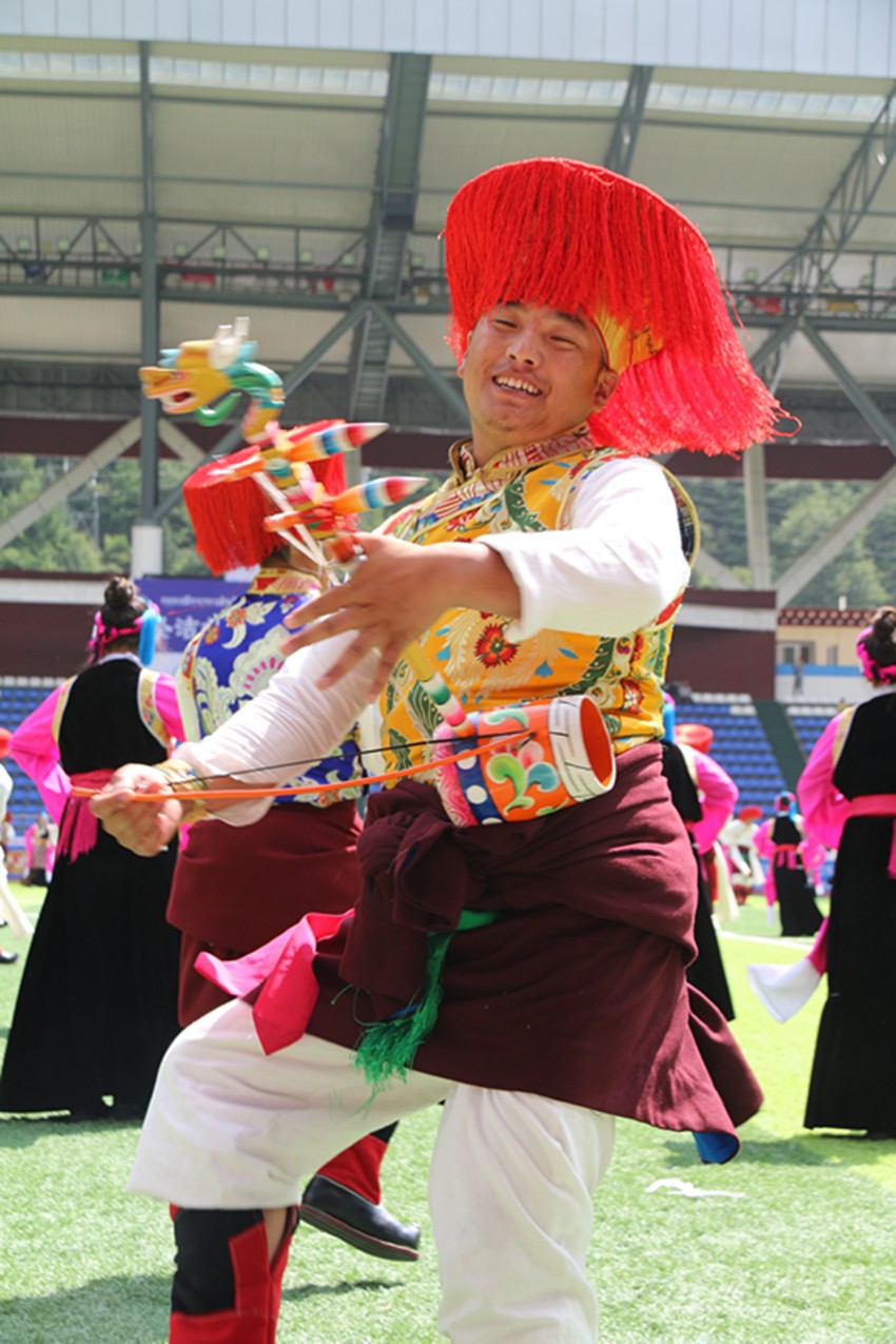 扎西腳蹬紅黑相間的藏式手工皮靴,提腿、反跨、揭回、點(diǎn)輾,系在腰間的紫紅色藏袍隨著弦律微微擺動(dòng),體態(tài)輕盈,溝壑縱橫的臉上洋溢著笑容。臺(tái)上的評委頻頻點(diǎn)頭,四周的觀眾紛紛鼓掌:“你看,扎西‘羌魯’跳得多好!‘諧本’就該是這樣!”