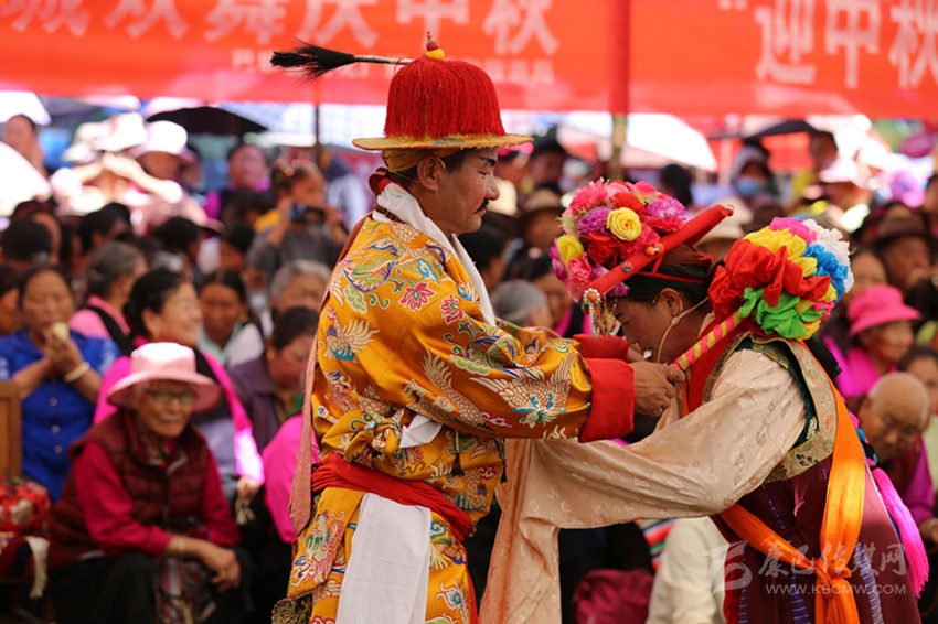 九月,龍王塘,藏戲《嘎拉旺布》演出現(xiàn)場(chǎng)。西繞反串花仙卓瓦桑姆,他頭戴花冠,頂上的三叉“巴珠”(后藏女人的一種頭飾)上插滿了粉色和紅色的絹花。身上穿著各色綢緞拼制成的無(wú)袖藏袍“拉姆切”,上套無(wú)袖彩條花氆氌帶和藍(lán)綠花緞帶連綴成的褂子。踩著鼓與鈸敲擊出的節(jié)奏,他的兩只腳進(jìn)、頓、點(diǎn)、退,舞步輕盈,手腕跟隨節(jié)奏,以頭部和肩部為限,左舞右蹈,用肢體語(yǔ)言表現(xiàn)人物的思想感情,這是該劇第一幕《定情月下》:湖畔仙景,卓瓦桑姆偕眾仙女婆娑起舞。國(guó)王隨仙鹿而來(lái),向卓瓦桑姆傾訴衷情,花仙為國(guó)王的真情所動(dòng),愿永結(jié)同心。仙翁降臨贈(zèng)箭祝福,二人辭別眾仙……。炎炎烈日下,西繞薄施脂粉的面頰已被幾行汗水弄花,但他不以為意,此時(shí)此刻,他不是西繞,而是花仙卓瓦桑姆。從進(jìn)場(chǎng)伊始,他便與角色融為一體。周遭的觀眾認(rèn)真觀看、解讀,現(xiàn)場(chǎng)一片和諧,最美的時(shí)光在這一刻被盡情雕刻。